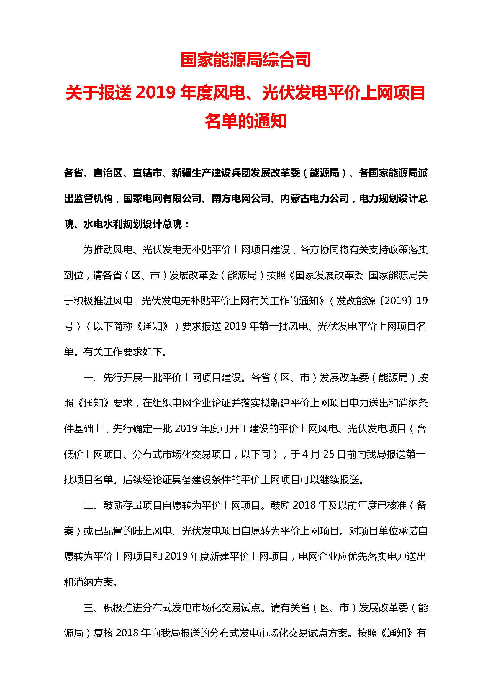緊急| 關于報送2019年度風電(diàn)、光伏發電(diàn)平價上(shàng)網項目名單的通(tōng)知