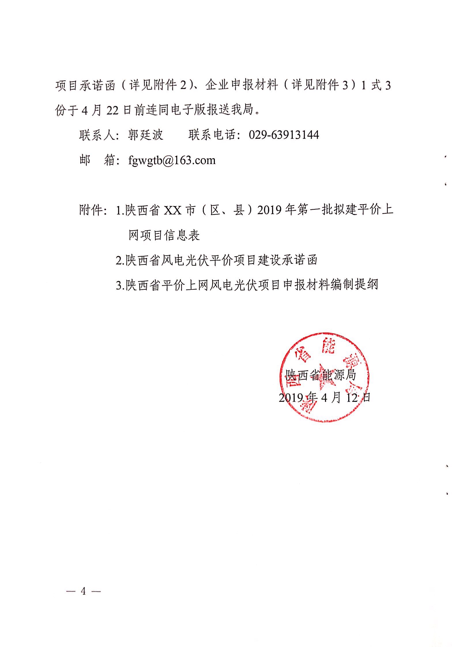 陝西省能源局 陝能新能源[2019]4号 《關于開(kāi)展風電(diàn)光伏平價項目申報工作(zuò)的通(tōng)知》