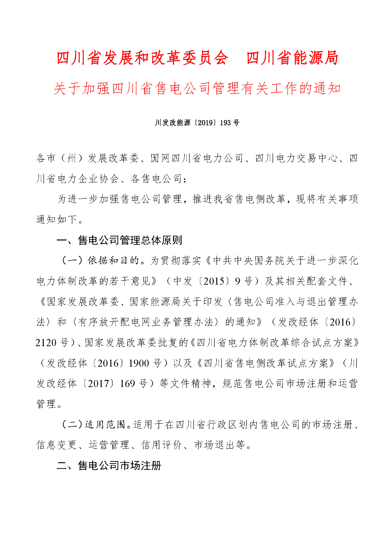 四川省發展和(hé)改革委員會(huì) 四川省能源局關于加強四川省售電(diàn)公司管理(lǐ)有(yǒu)關工作(zuò)的通(tōng)知(川發改能源〔2019〕193号)
